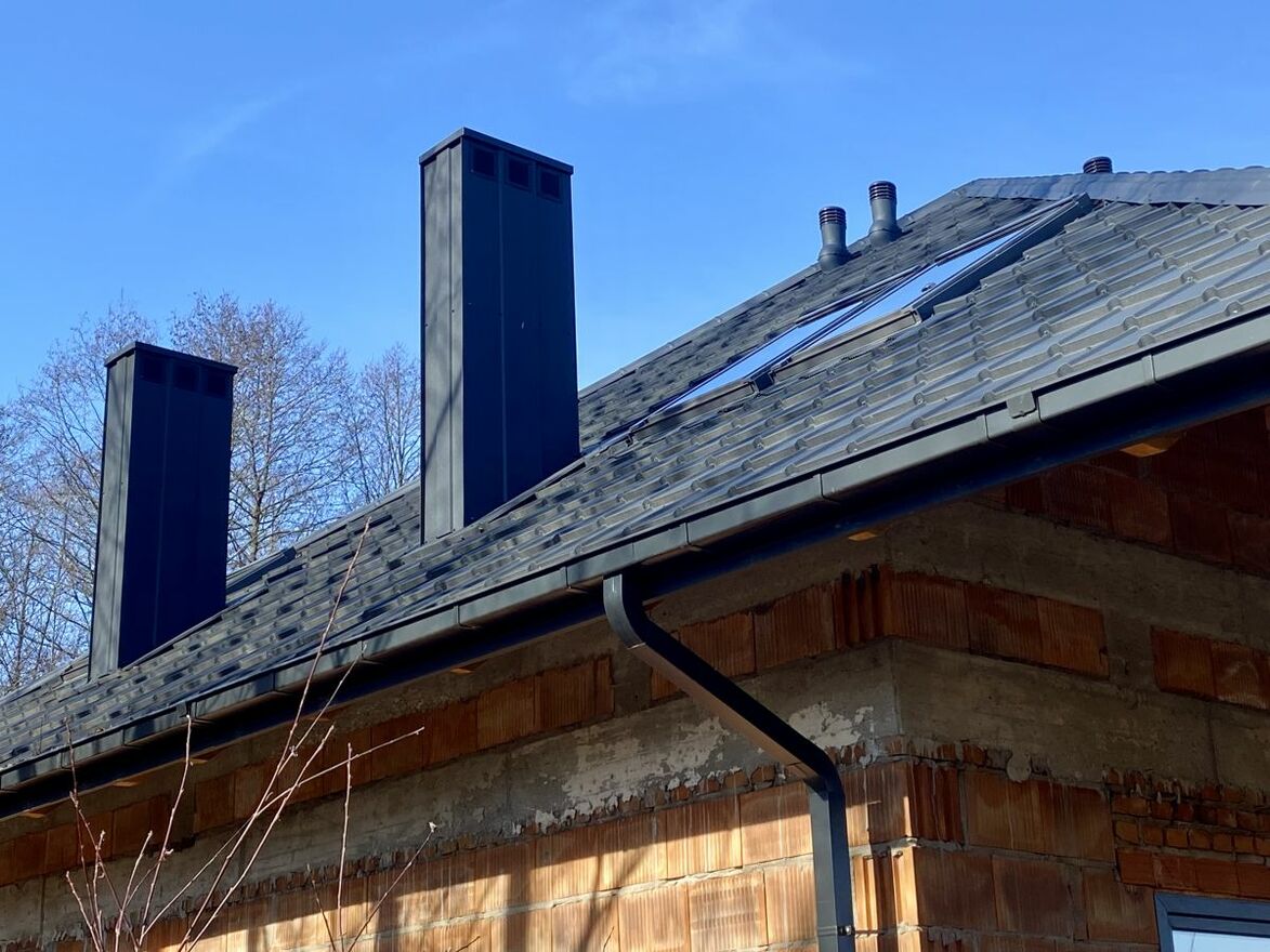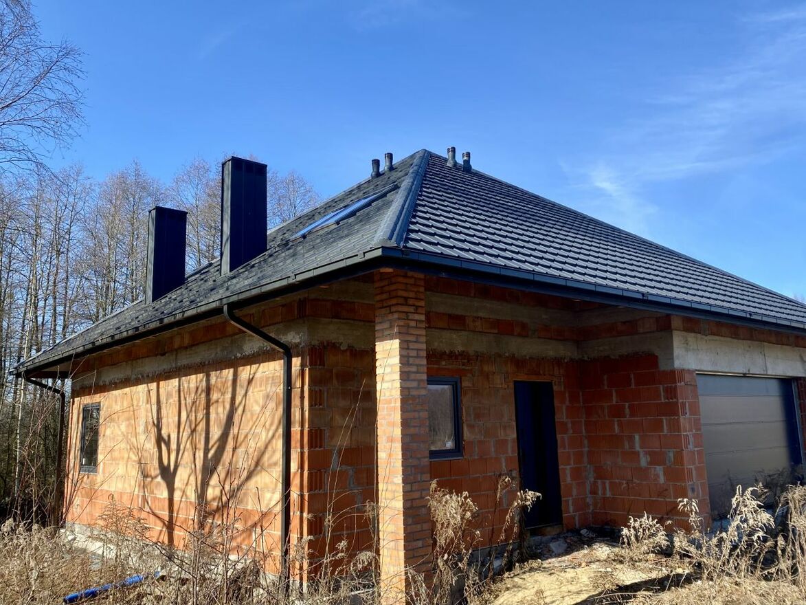 Dach: blachodachówka, pełne orynnowanie, kominy wentylacyjne